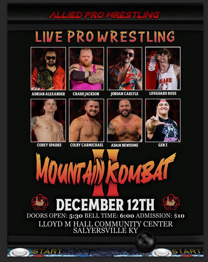 The show is dubbed Mountain Kombat II. The professional wrestlers scheduled to appear are Adrian Alexander, Crash Jackson, Jordan Carlyle, Lifeguard Ross, Corey Sparks, Colby Carmichael, Adam Newsome and Gen Z.