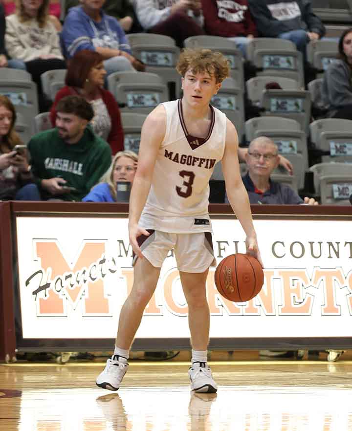 Parker Bowling handled the ball for Magoffin County during a game in the 2024-25 boys’ high school basketball season. Photo || Jim Arnett