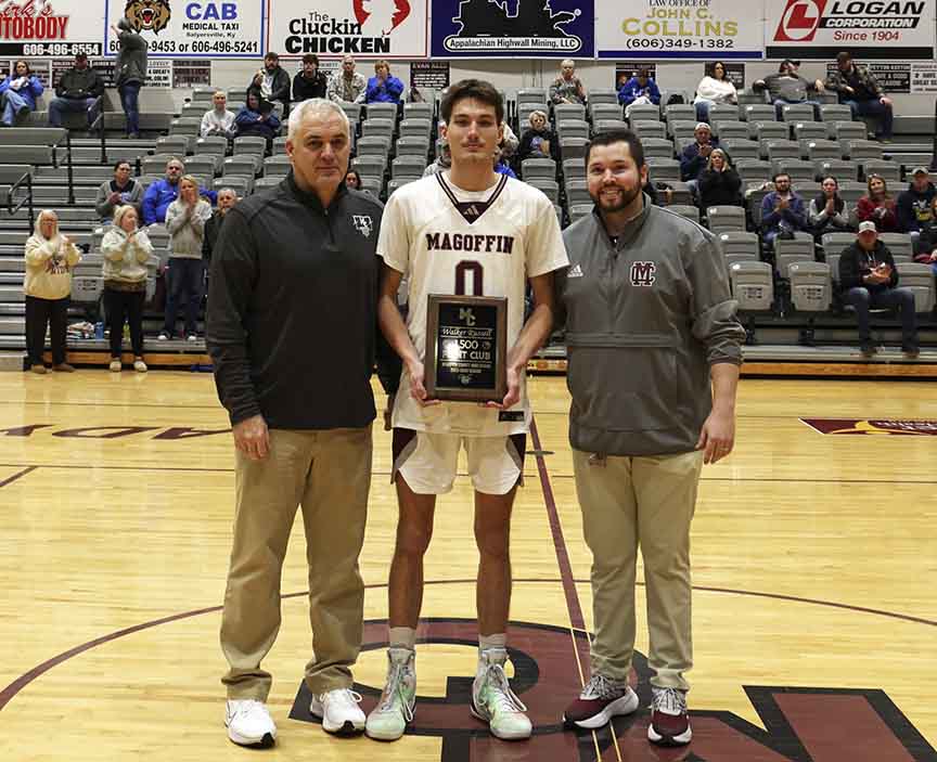 Prior to its home game versus Letcher County Central on Tuesday, Jan. 20, Magoffin County recognized Russell. Magoffin County Head Coach Scott Castle and MC Athletic Director Gabe Burchell presented Russell with a commemorative plaque.